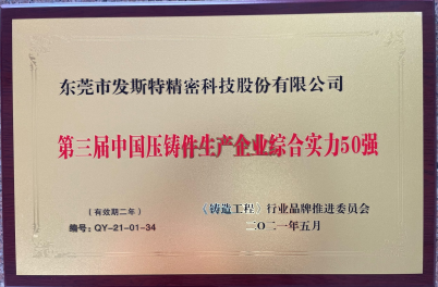 2021年6月、東莞ファスター精密技術有限公司は、中国鋳造協会の雑誌『Foundry Engineering』誌が主催し、香港鋳造工業協会と広東鋳造工業協会共催で開催された第3回「中国トップ50ダイキャスティングメーカー」(中国トップ50ダイキャスティング企業)の名誉称号を獲得しました。